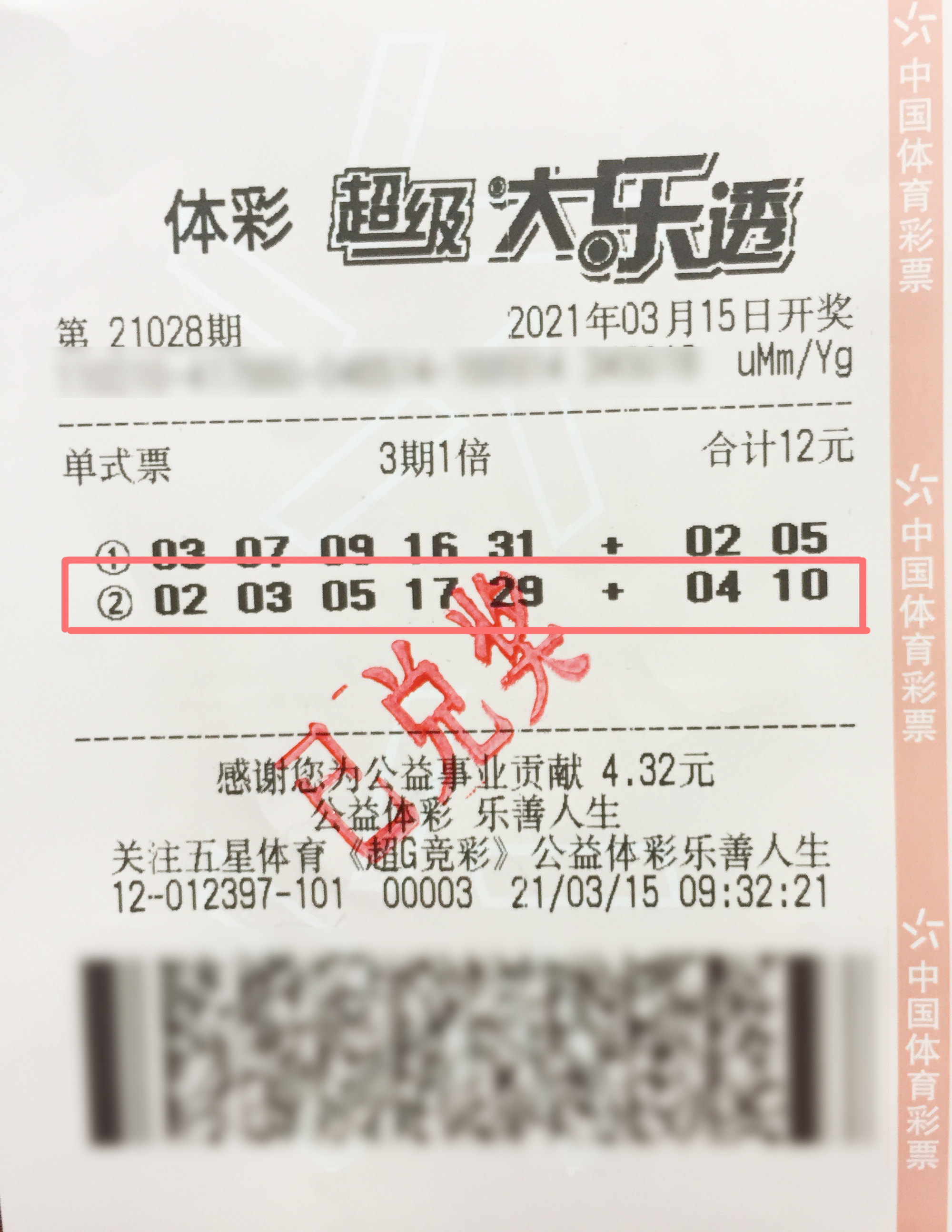 3月15日,体彩大乐透第21028期前区开出号码“02、03、05、17、29”,后区开出号码“04、10”。共开出5注一等奖。单注奖金为1000万元,分别落在北京朝阳区、吉林长春市、上海浦东区、云南大理市、青海果洛州。上海中得当期1000万元头奖的这张幸运彩票来自浦东新区金杨路779号的12397体彩兼营网点。