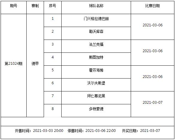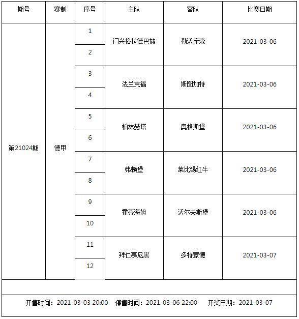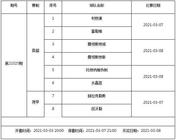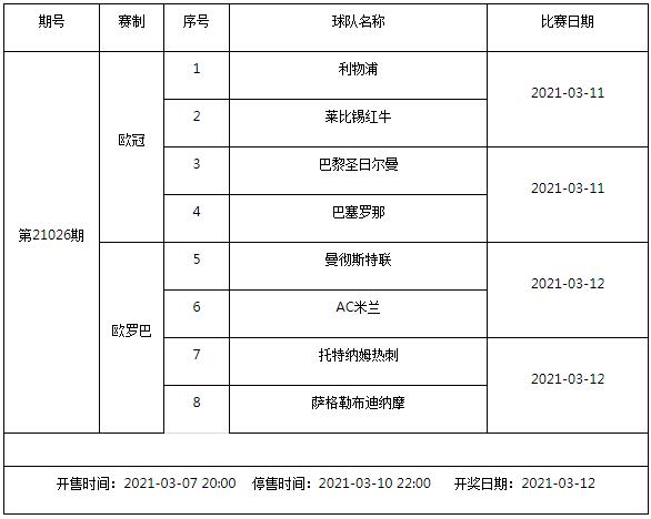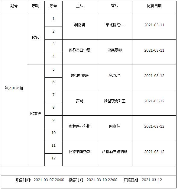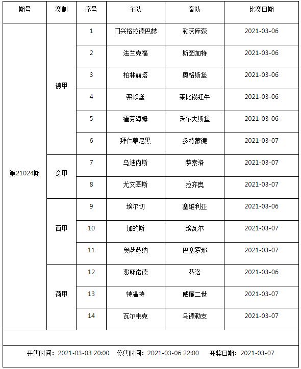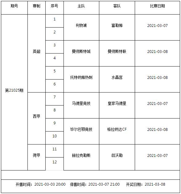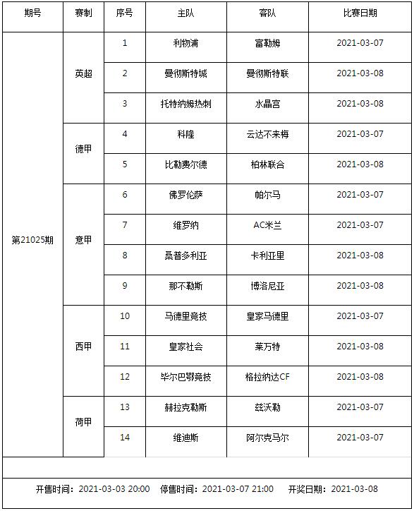 我中心制定了2021年中国足球彩票胜负游戏(14场、任选9场)、6场半全场胜负游戏和4场进球游戏3月5日-3月11日的竞猜场次安排(具体附后),其竞猜对象、开售时间、停售时间和计奖时间均以本文为准。