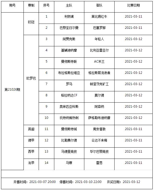 3. 足球彩票胜负游戏(14场和任选9场)第21026期